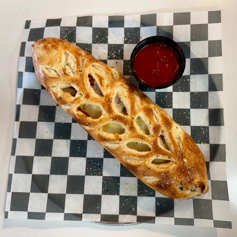 Our fresh dough with your favorite toppings, fill it with cheese and lightly brush the outside with garlic butter. Served with marinara on the side.